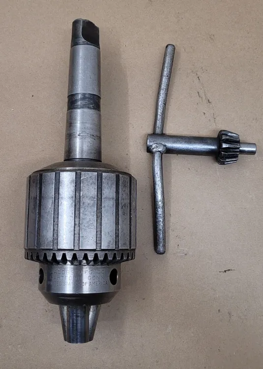 Jacobs 20N Super Drill Chuck, used condition. Includes #5 chuck key and AO405 chuck arbor with #4 MT and No 5 Jacobs taper. Compatibility: 3/8”-1” capacities. Ideal for various tooling applications.