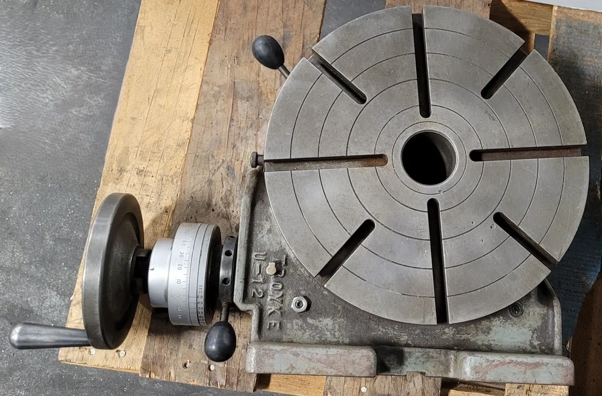 Troyke 12" Rotary Table, Model U-12. Used condition, horizontal/vertical/manual. Features T-slotted surface, 2" bore hole. Perfect for precise tooling applications. Manufacturer: TROYKE. Lot: 3405-7. Ideal for enhancing your workshop’s versatility.