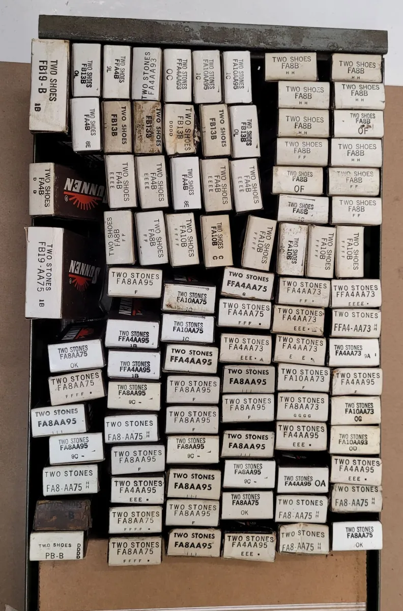Sunnen Stones & Shoes set, 91 pieces; tooling & accessories. Variations include FA and FB series stones and shoes. Items are used, still in boxes. Unclear box completion. Includes green drawer. Ideal for tooling enhancements.