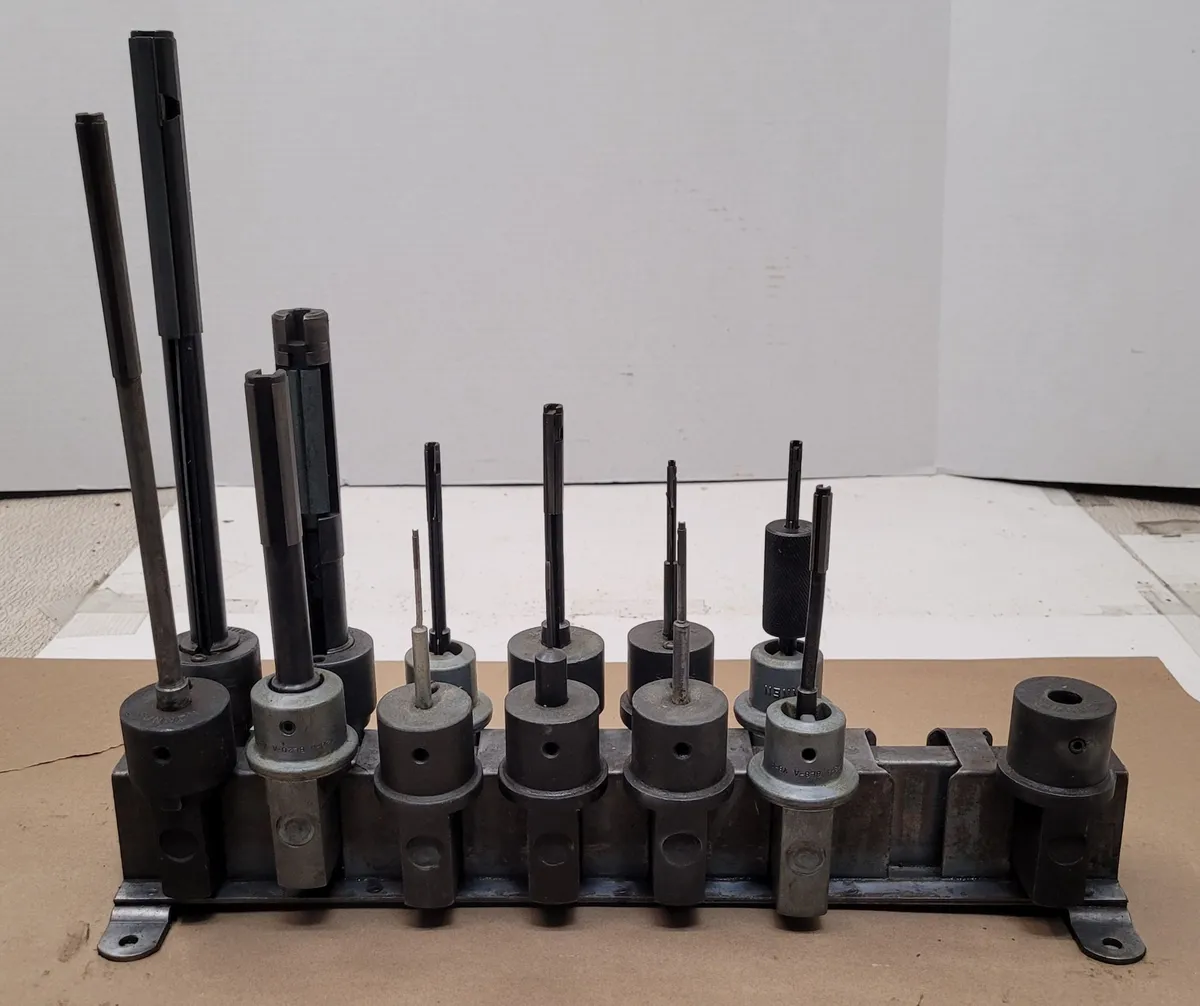 SUNNEN Honing Mandrels Set with rack, used, includes 12 mandrels in various sizes plus an extra D6-A/D8-A Adapter without mandrel. Ideal for tooling needs, offering versatility and efficiency in one comprehensive set.