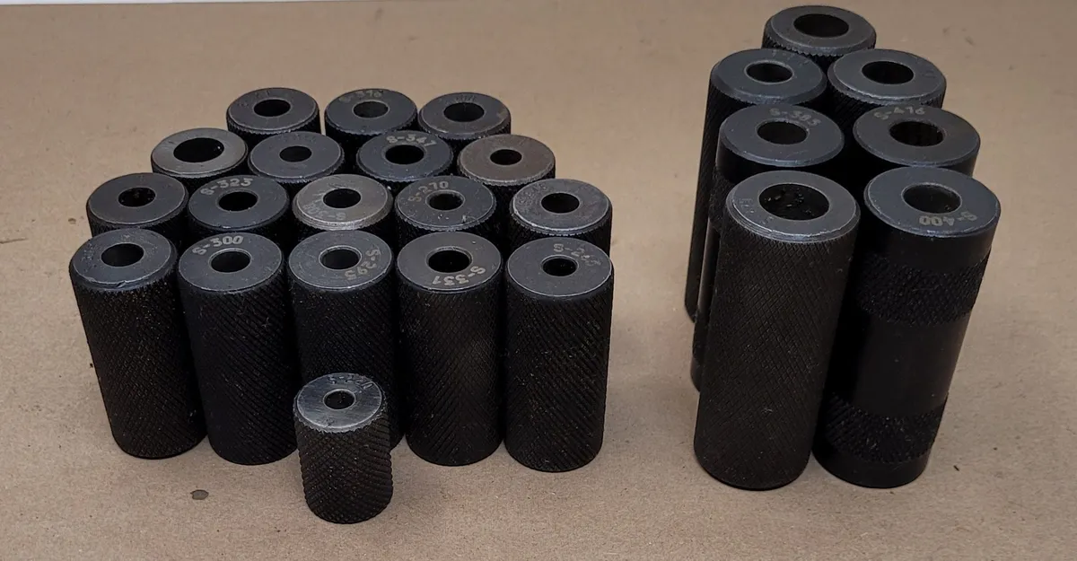 Sunnen Truing Sleeves set of 25 for hone tooling applications. Included sizes: 4x S-245, 2x S-308, S-400, S-323, plus various other specific sizes. One sleeve size unidentified. Brand quality with diverse sizing in this used set.