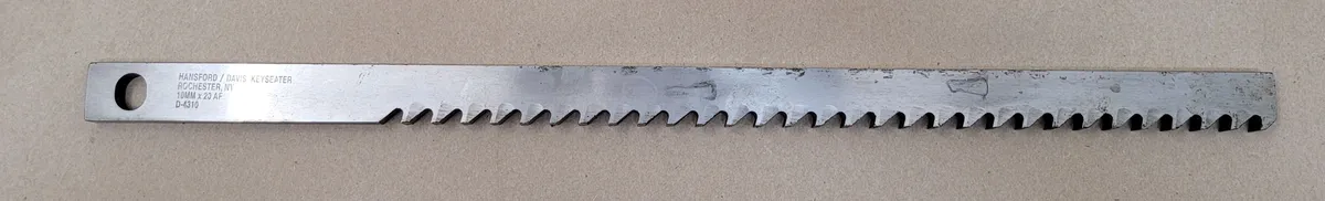 Hansford/Davis D-4310 Keyseater for sale, a precise 10mm x 20AF tooling solution. Model D-4310 in used condition, perfect for machining needs. Keyseater Broach: 10mm width, 1" height, 1/2" pitch, and 20" length. Ideal for precision cuts.
