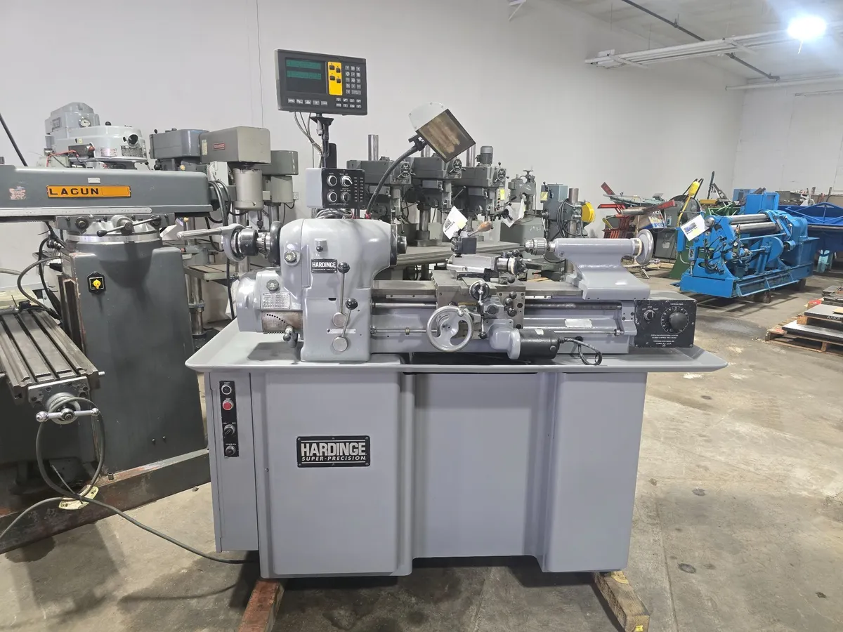 Used Hardinge HLV-H wide bed toolroom lathe with 11" swing, 18" centers, and 1.25" spindle bore. Features 2-axis DRO, 4" 3-jaw chuck, and quick-change toolpost. Offers variable speeds up to 3,000 RPM and comes equipped with power feeds.