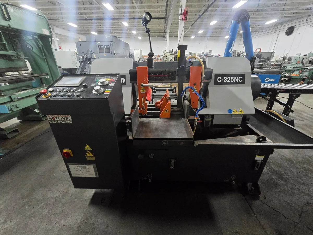 The Cosen C-325NC is a fully automatic horizontal scissor-style band saw designed for production, featuring a 12.8" round/square and 12.8" x 15" rectangular cutting capacity. It is equipped with a 5 HP blade motor, inverter-driven speeds of 50-328 FPM, and a 150.4" x 1.25" blade. The machine utilizes SNC-100 controls with a 5.7"–7" HMI touch screen.