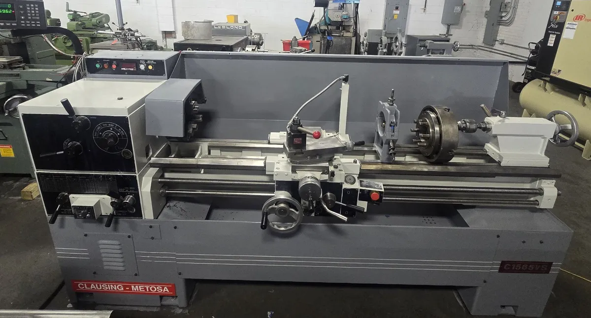 The Clausing Metosa C1565VS is a 15" x 65" gap bed engine lathe featuring a DRO, 7.5 HP motor, 0–2300 RPM variable spindle speed, and a 2.05" spindle bore.